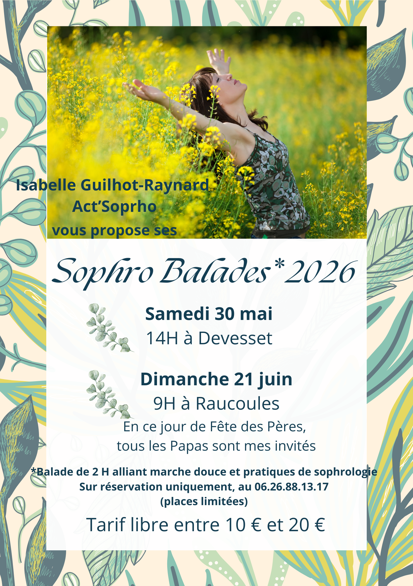 DEVESSET LE LAC, DEVESSET, FrancePour cette première balade de l'année, je vous donne rendez-vous au Lac de Devesset (07). Selon l'envie, l'humeur du jour, nous pourrons expérimenter la marche en pleine présence (marche méditative), la marche afghane, des mouvements doux issus de la sophrologie, nous jouerons avec nos sens, avec notre respiration, avec notre équilibre, nous visiterons de jolis souvenirs, passés ou d'avenir... En ces temps de tumulte, d'incertitude, je suis heureuse de partager avec vous une parenthèse de souffle, de silence, de connexion à soi, aux autres, à la Nature... et ça fait un bien fou ! Tarif, selon vos possibilités, entre 10 et 20 €. Durée : 2H à 2H30 Il s'agit d'une balade douce, cependant une bonne condition physique est préférable (en cas de doute, n'hésitez pas à m'en parler avant de vous inscrire). Je vous remercie de bien vouloir noter que ce type de balade n'est pas approprié aux enfants en-dessous de 12 ans. Vos animaux de compagnie peuvent se joindre à nous, tenus en laisse. Les téléphones portables sont admis, à la condition expresse d'être éteints. Sur réservation uniquement car places limitées (10 personnes au maximum). Annulation en cas d'intempéries notoires (une légère pluie ne nous arrêtera pas !) […]